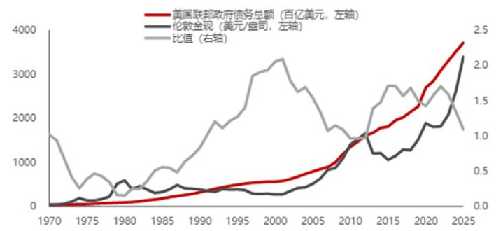 所以我们看到最好的拟合曲线是美债和黄金总价值量的比较。在过去80年的周期中,这一拟合关系仍是非常稳定的。所以乐观者甚至认为,如果全球资产从美债中继续外溢,黄金可以涨到6000美元。