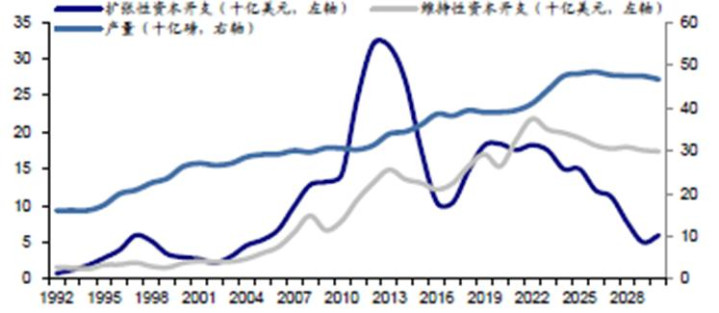 ·资本开支不足(一半左右还为维护性),导致新增产能有限。2010 - 2020 年全球资源类资本开支持续低迷,尽管 2020 年后有所回升,但新增产能释放滞后,预计供给高峰将出现在 2028年后,且增产幅度有限。