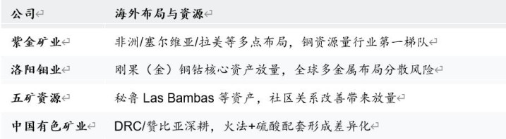 中国是全球最大的制造业产地,国内有色金属储量相对匮乏,如铜精矿对外依存度约 80%。为保障资源安全,我国有色央国企带头出海收购海外优质矿山,足迹遍布刚果金、澳大利亚、秘鲁等资源富集国。紫金矿业收购塞尔维亚 Timok 铜金矿、五矿集团拿下秘鲁 Las Bambas 铜矿等,构建了自主可控的全球供应链体系。
